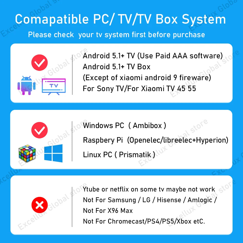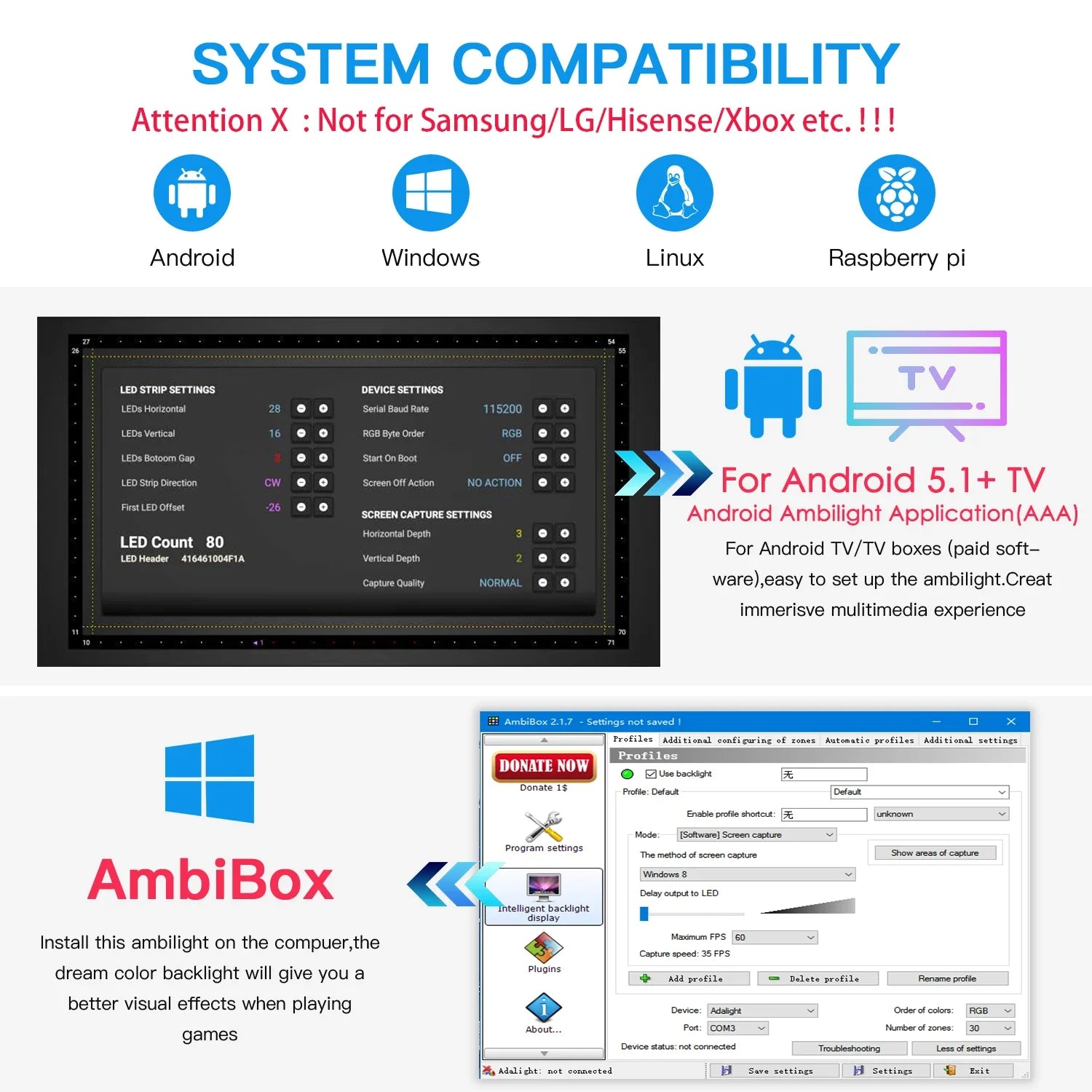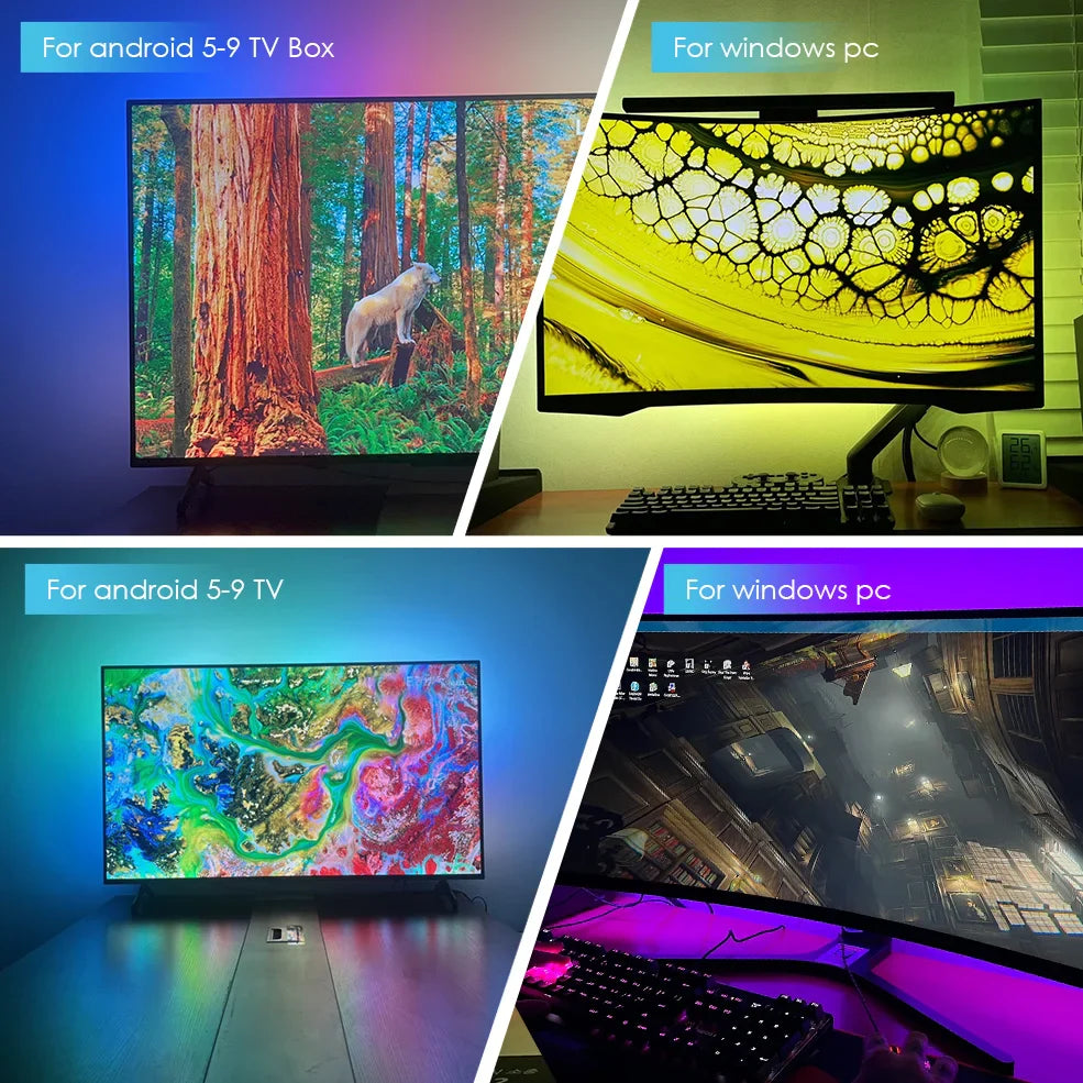 Needs:Android TV/TV boxs(Android 5.1/6/7/8/9): 'Ambient light Application for Android'Paid software)